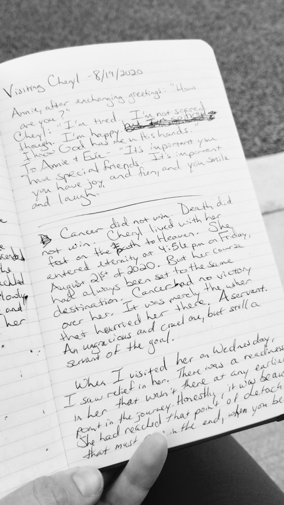 The tears came and went through the day. I confided in a friend who knows the pain of losing family to terrible cancer battles, and pushing through the workdays despite the distraction of that pain. I glanced through favorite photos and smiled at her smile. Cheryl hovered in my thoughts in each hour, sometimes in the foreground and sometimes in the back. When evening came and my kids were settled at their dad’s for the night, the restlessness crowded me in the quiet of my home. You know, that restlessness that comes with a longing that can’t be eased.